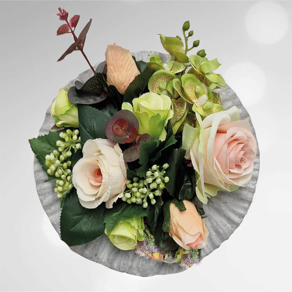 Terug naar het overzicht Zijden bloemstuk 1a Rond potje met bloemen in afmetingen: 22cm diameter x 12cm(hoog) Bestellen